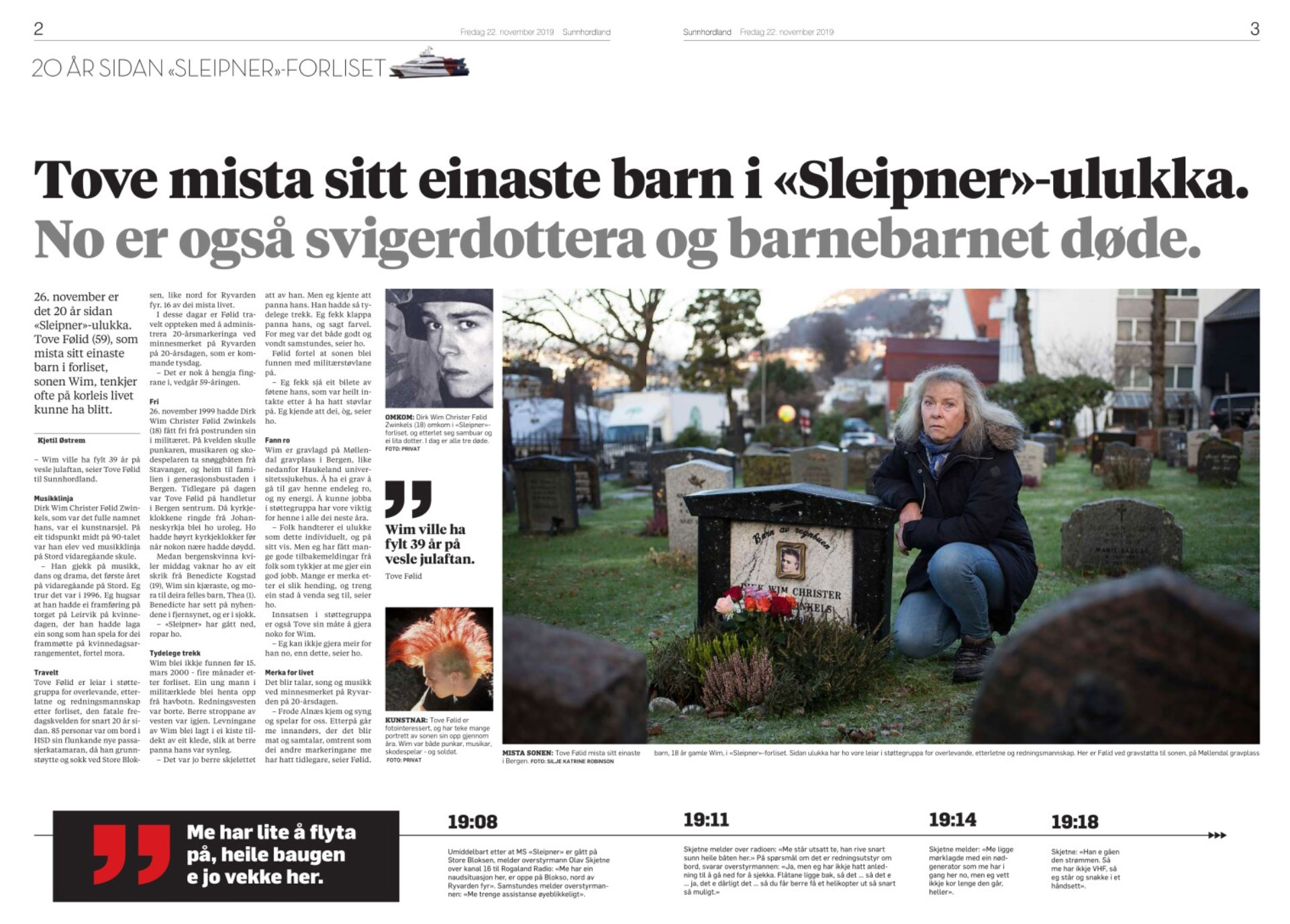Ei av dei som fortel er Tove Følid (pluss-sak). Ho er leiar i støttegruppa for overlevande, etterletne og redningsmannskap etter forliset. Sjølv mista ho den 18 år gamle sonen sin. Sidan har ho lidd fleire tap. Sonen hadde kjæraste og ei eitt år gamal dotter då han døydde. I dag er dei også døde. Sunnhordland har gjort historia ekstra sterk ved å dele lydopptak av naudanropet frå MS «Sleipner» (sjå under).