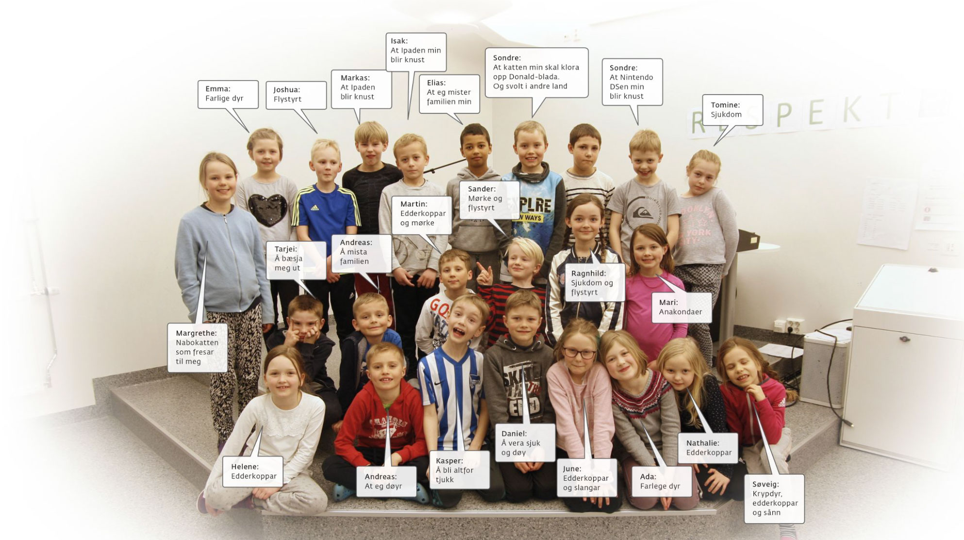 Elevane fortel også kva dei sjølv er mest redde for, som er alt frå nabokatten til å miste familien.