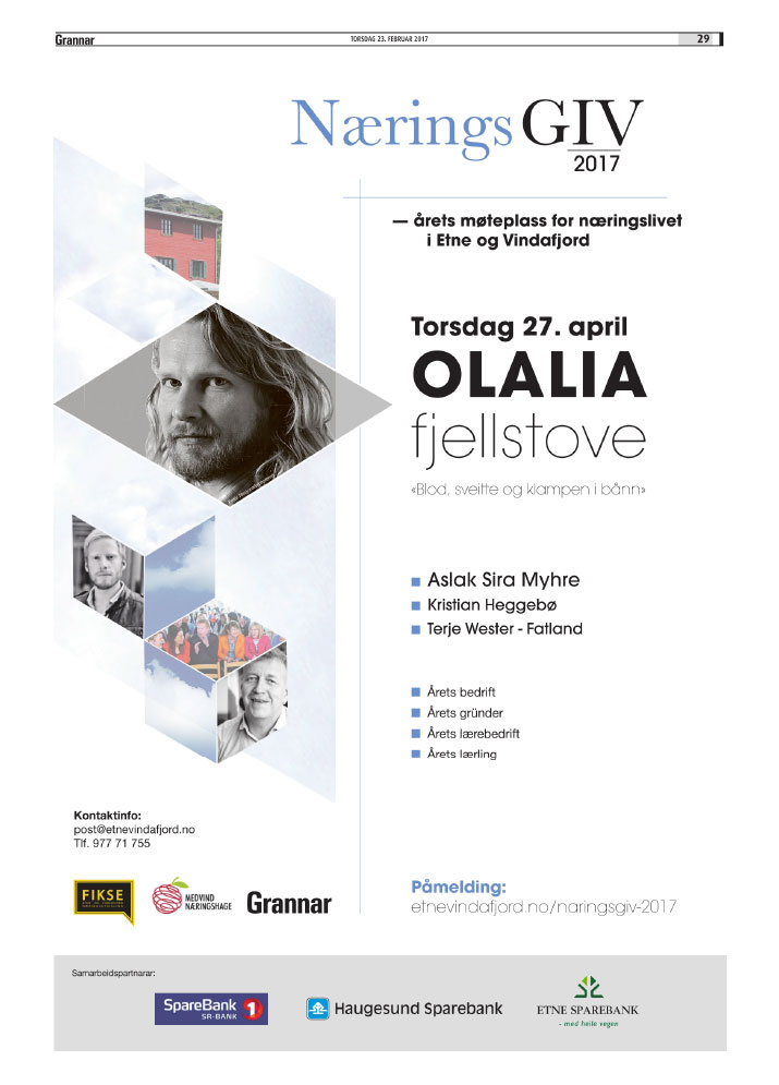 – Me har ikkje direkte inntekter på konferansen, men ser på den som et fint høve til å bygge relasjonar til det aktive næringslivet i distriktet. Grannar lager to næringsnummer kvart år, og føler at me i etterkant av Næringsgiv har betre respons på annonsesalg og tips.
