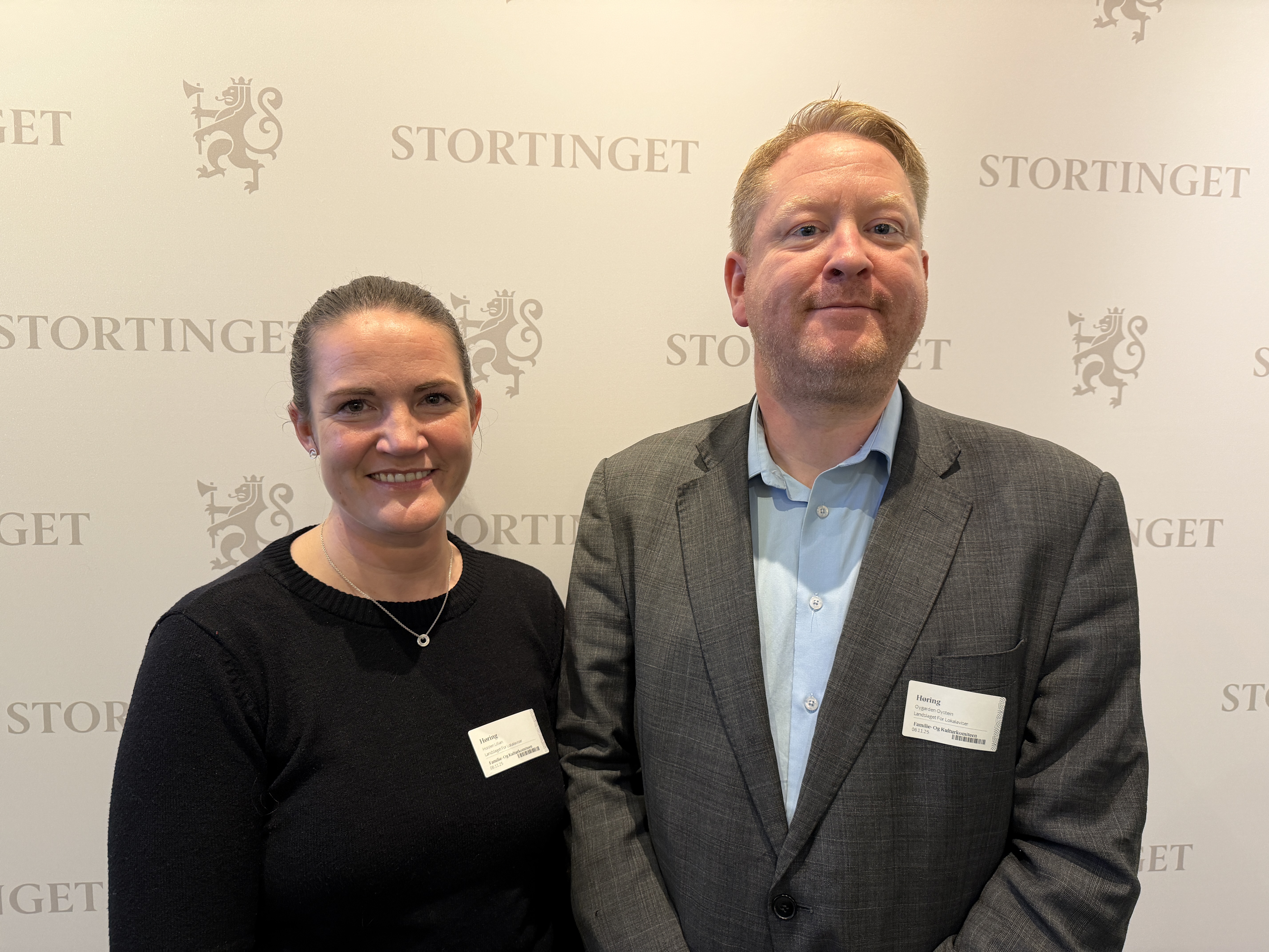 LLAs styreleiar Øystein Øygarden og nestleiar Lillian Holden i Stortinget i går. I dag gler dei seg over at regjeringa vil ta omsyn til lokalavisene når ny postlov skal på plass.