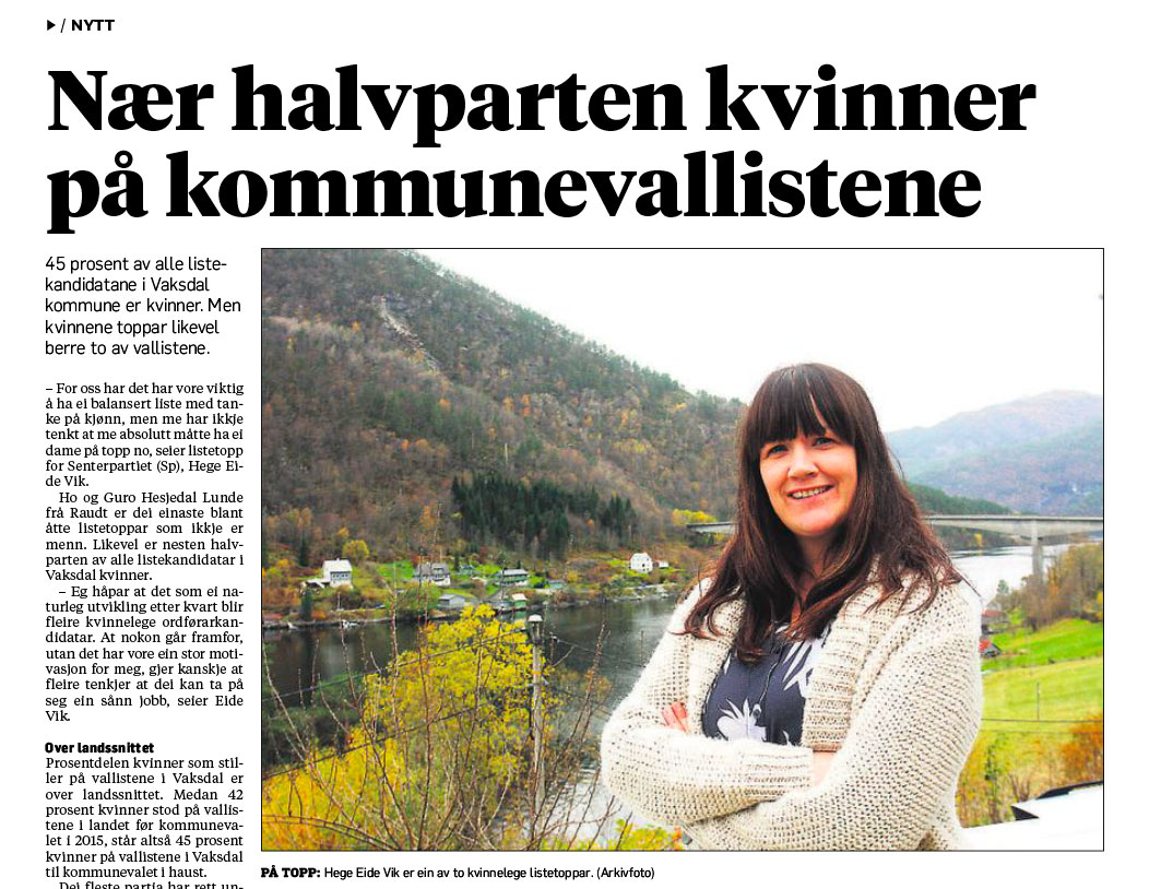Kristine Næss Thorsen i Vaksdalposten har sett nærare på vallistene i Vaksdal. Ho har sett på både kjønn, alder og folk med innvandrarbakgrunn. I listene fann ho fleire interessante vinklingar. Mellom anna er 45 prosent av alle listekandidatane i Vaksdal kommune kvinner – men kvinnene toppar berre to av vallistene. Ho har også funne unge listetoppar, og ho har intervjua Jamal frå Syria som er kumulert på vallista til MDG og dermed kan bli den første innvandraren i kommunestyret.